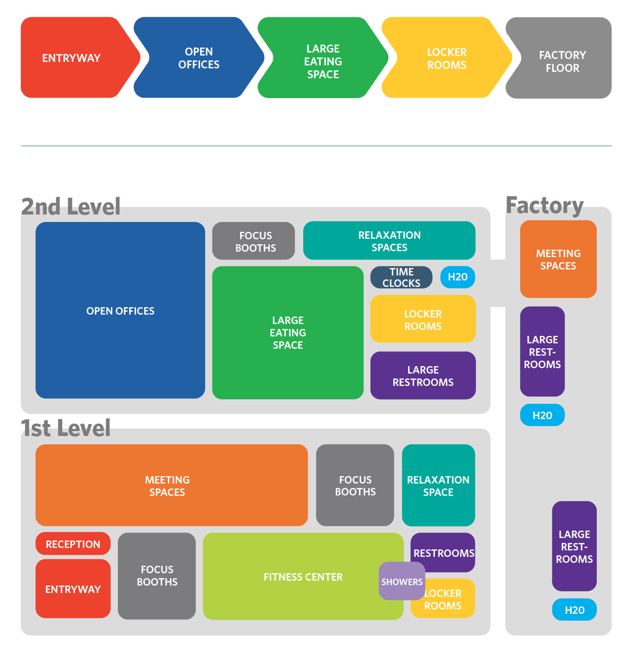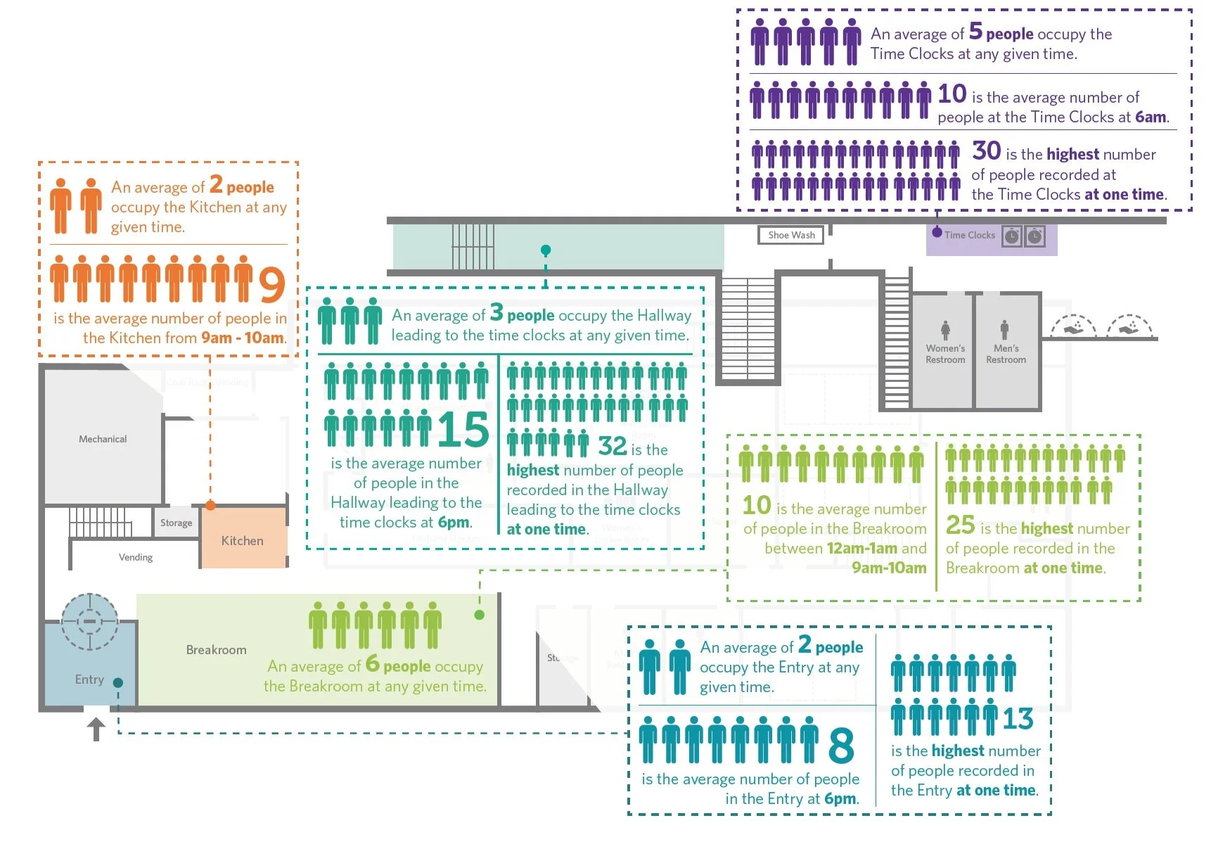 Crowding was a significant problem only for the factory workers. Spaces were underutilized except for at peak times, when they were extremely crowded. Important areas like the breakroom and bathrooms were far away from the factory floor, which prevented employees from using them.