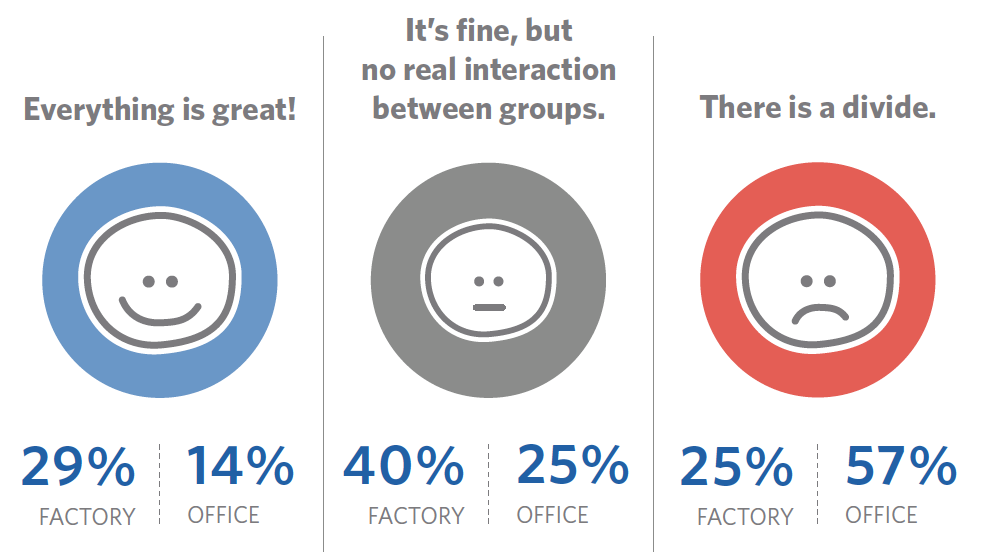 There was also a distinct cultural divide between the factory and office employees. In general, the factory employees had a generally more positive view of the relationship, while the office employees saw more of an issue.