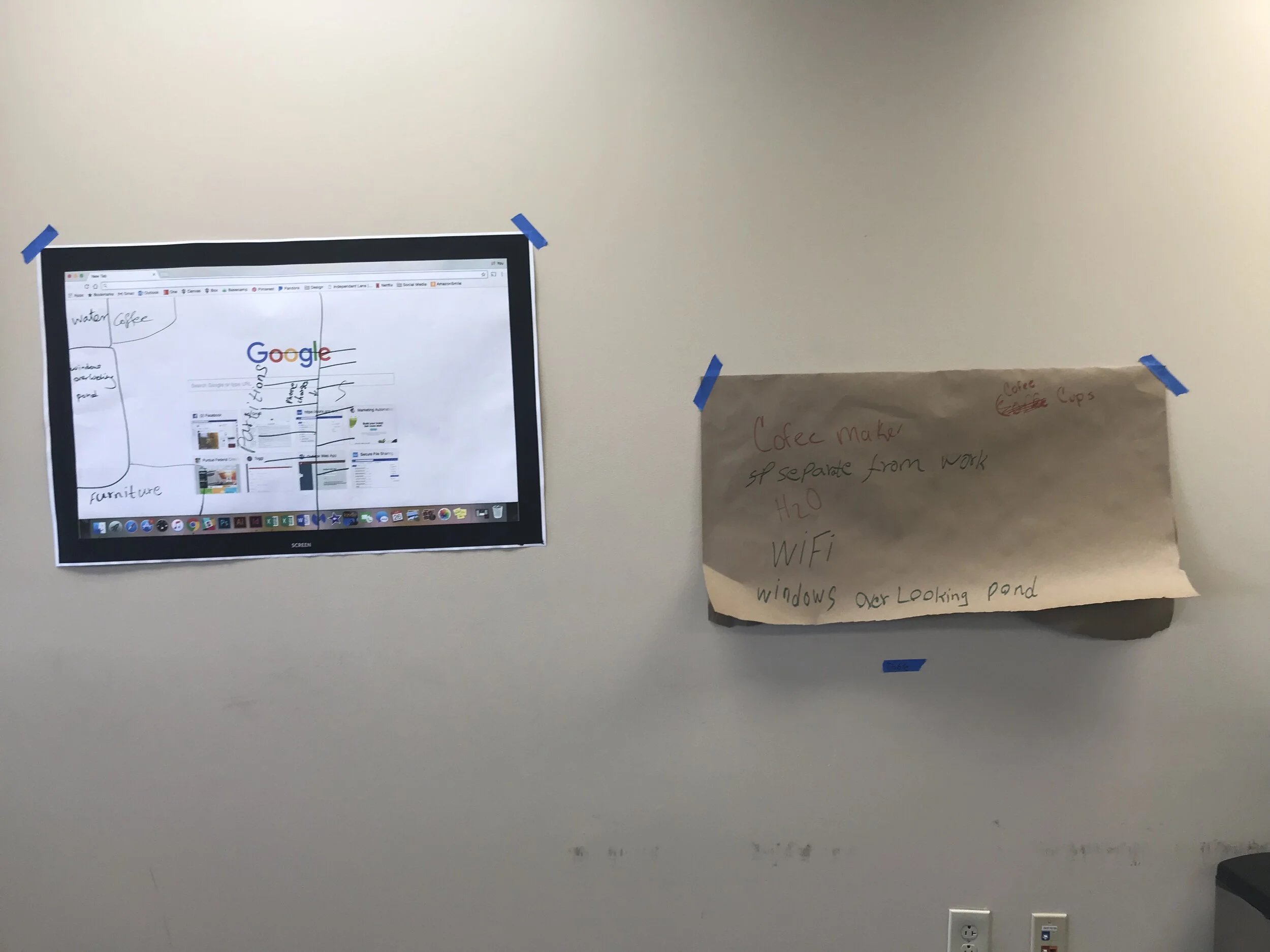 This group imagined a breakroom with a screen displaying important information, coffee, Wifi, and windows overlooking the pond.